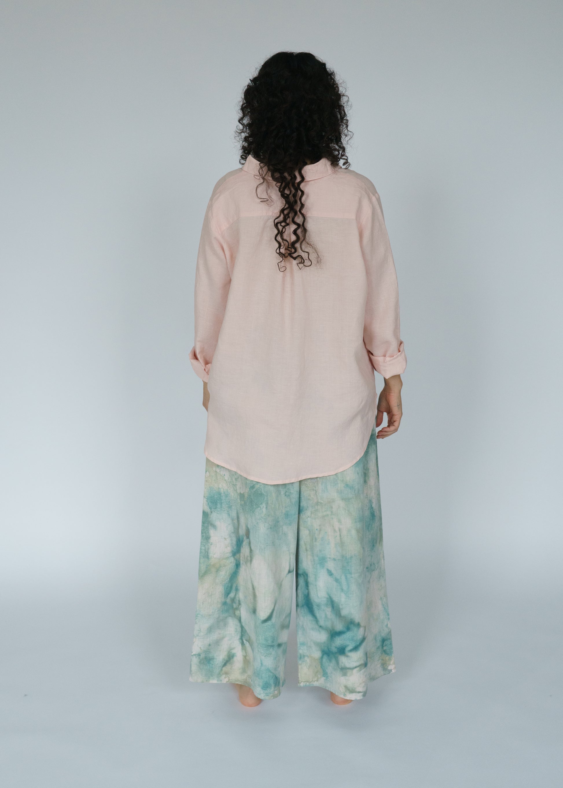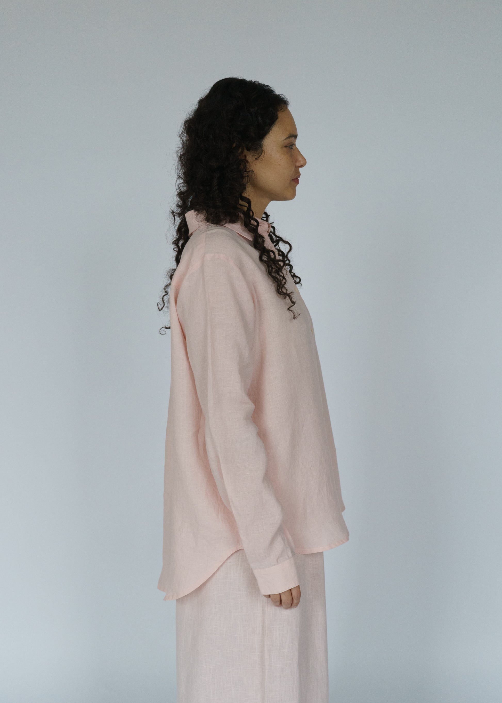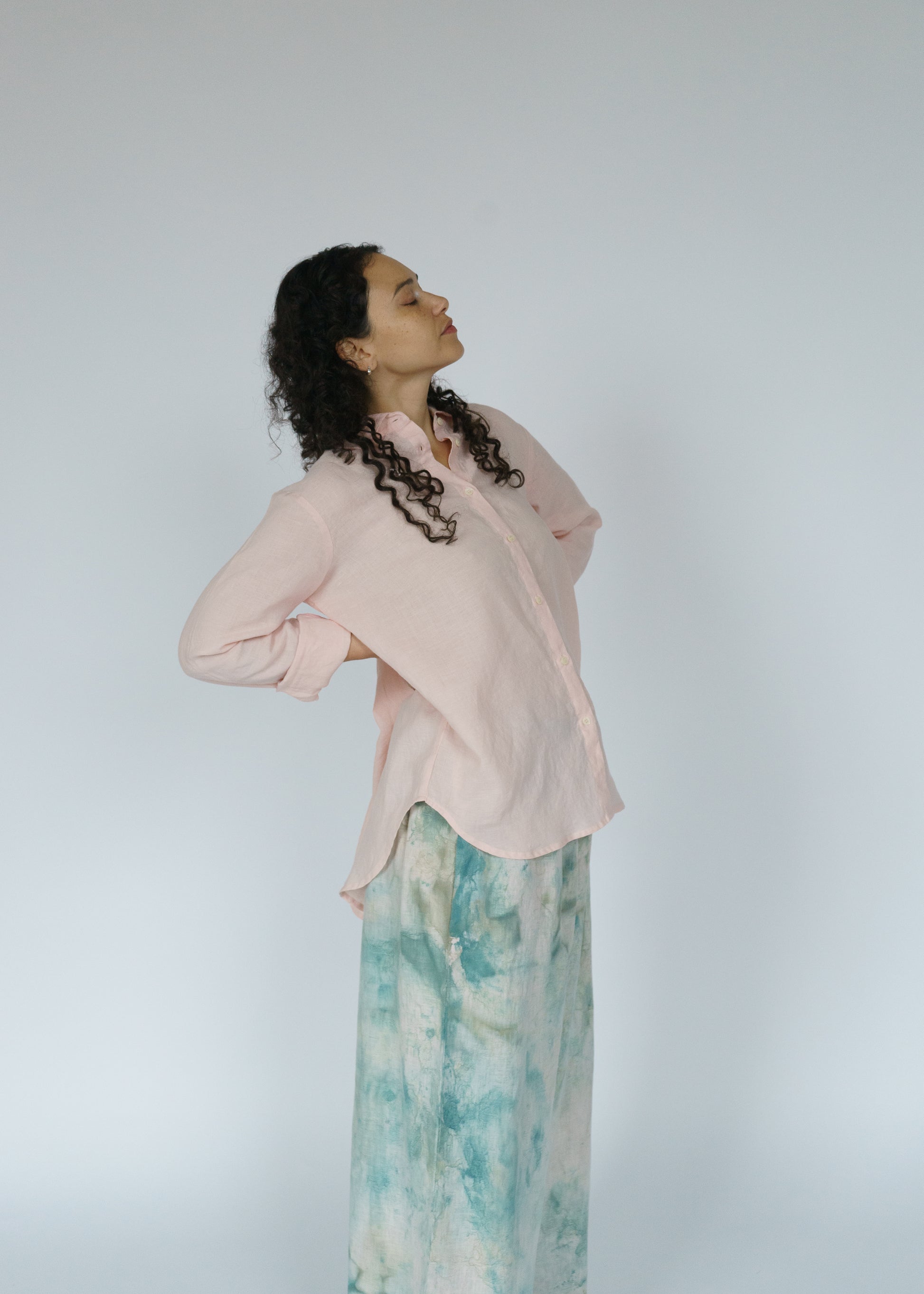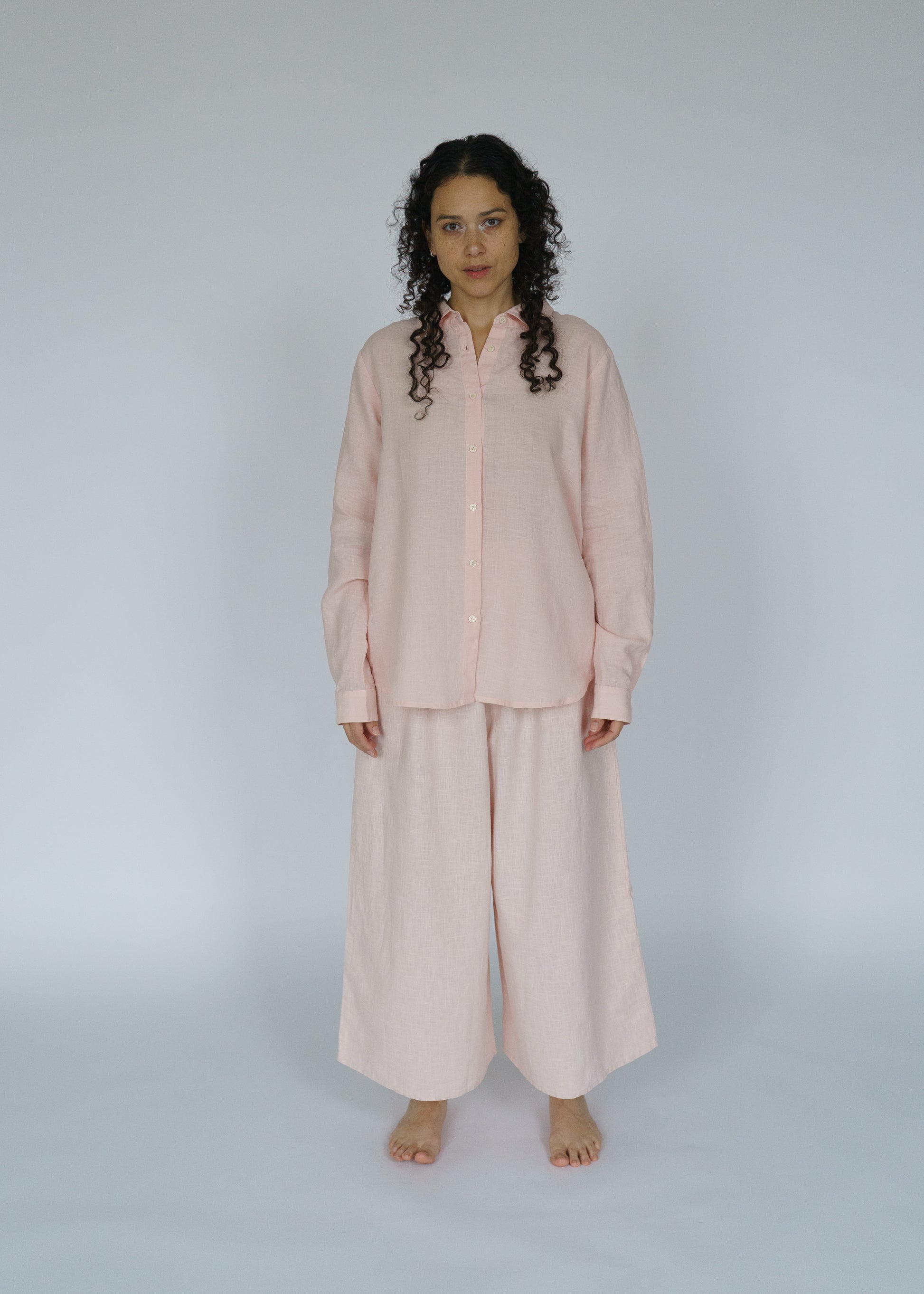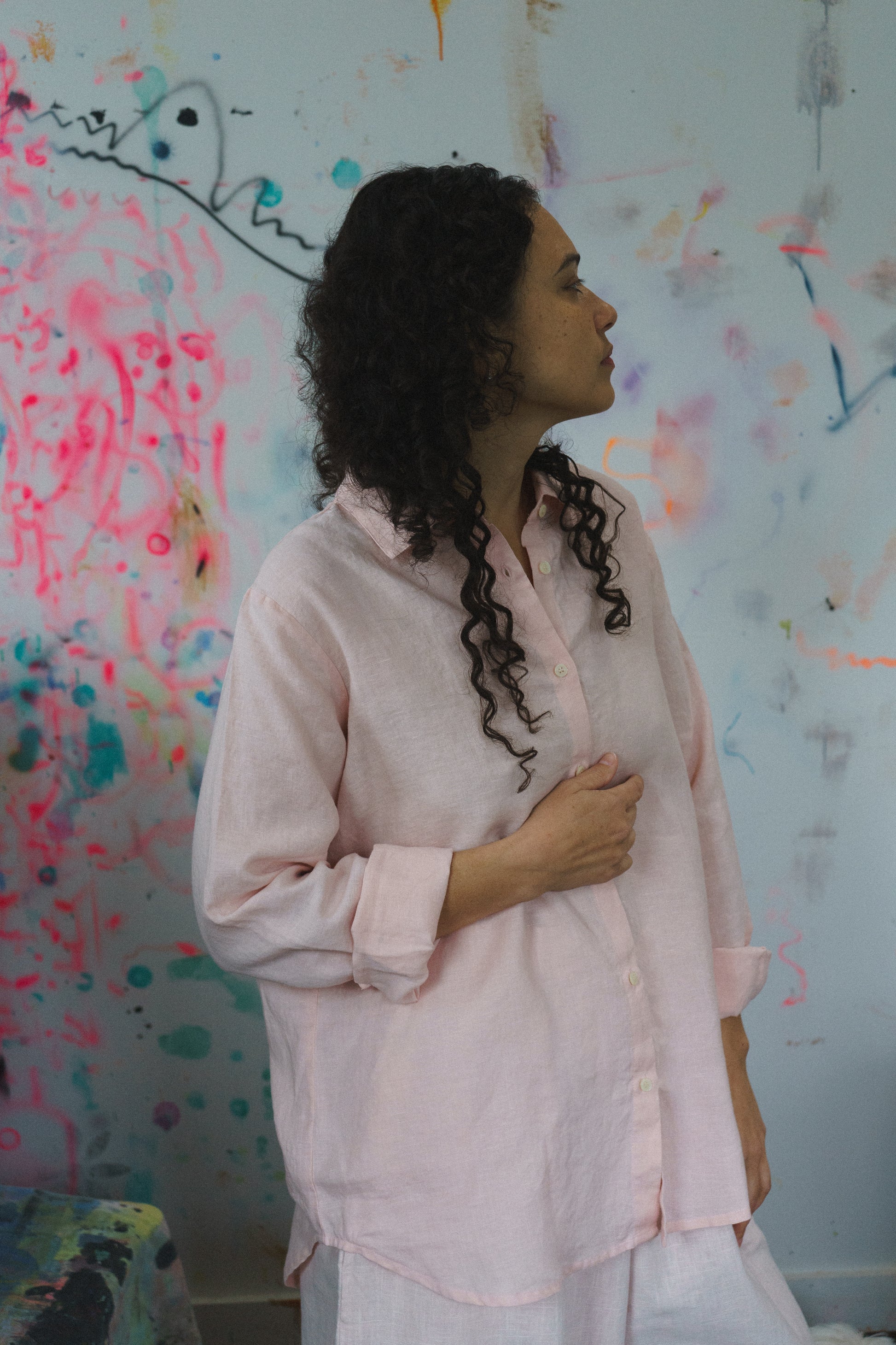 The Big Shirt in Rose is cut in our soft pink linen — the color of a baby flamingo or a bowl of frosting. Somehow both a neutral and a statement, ready to mix with denim, cream, or the matching Swayers for a dreamy head-to-toe look. Menswear lines meet loungewear ease, with generous sleeves and that oversized fit you’ll live in. It’s the kind of shirt that looks even better rumpled, like it’s seen a good day.