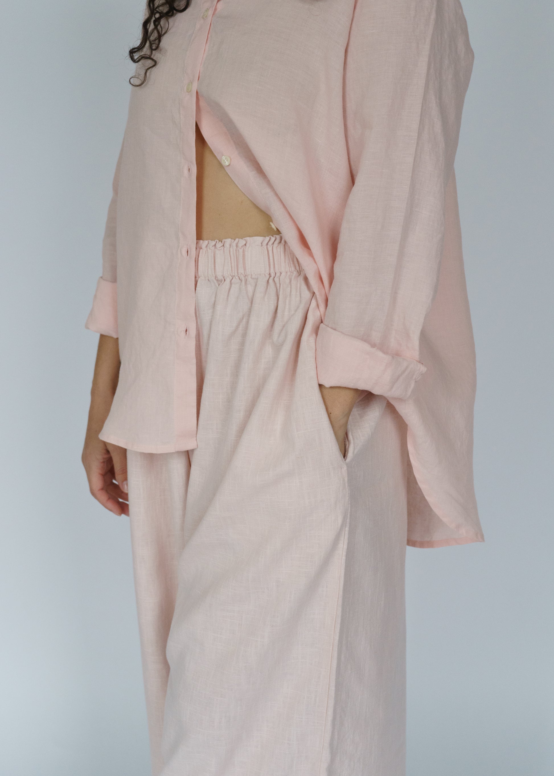 Astute shoppers may notice that while both the top and pants are made from 100% linen, the fabrics are slightly different weights — the shirt a bit lighter, the pants a touch sturdier. The shades of pink vary just the tiniest bit, but together they create a beautifully nuanced set. Barely noticeable, but worth mentioning for the eagle eyes out there.