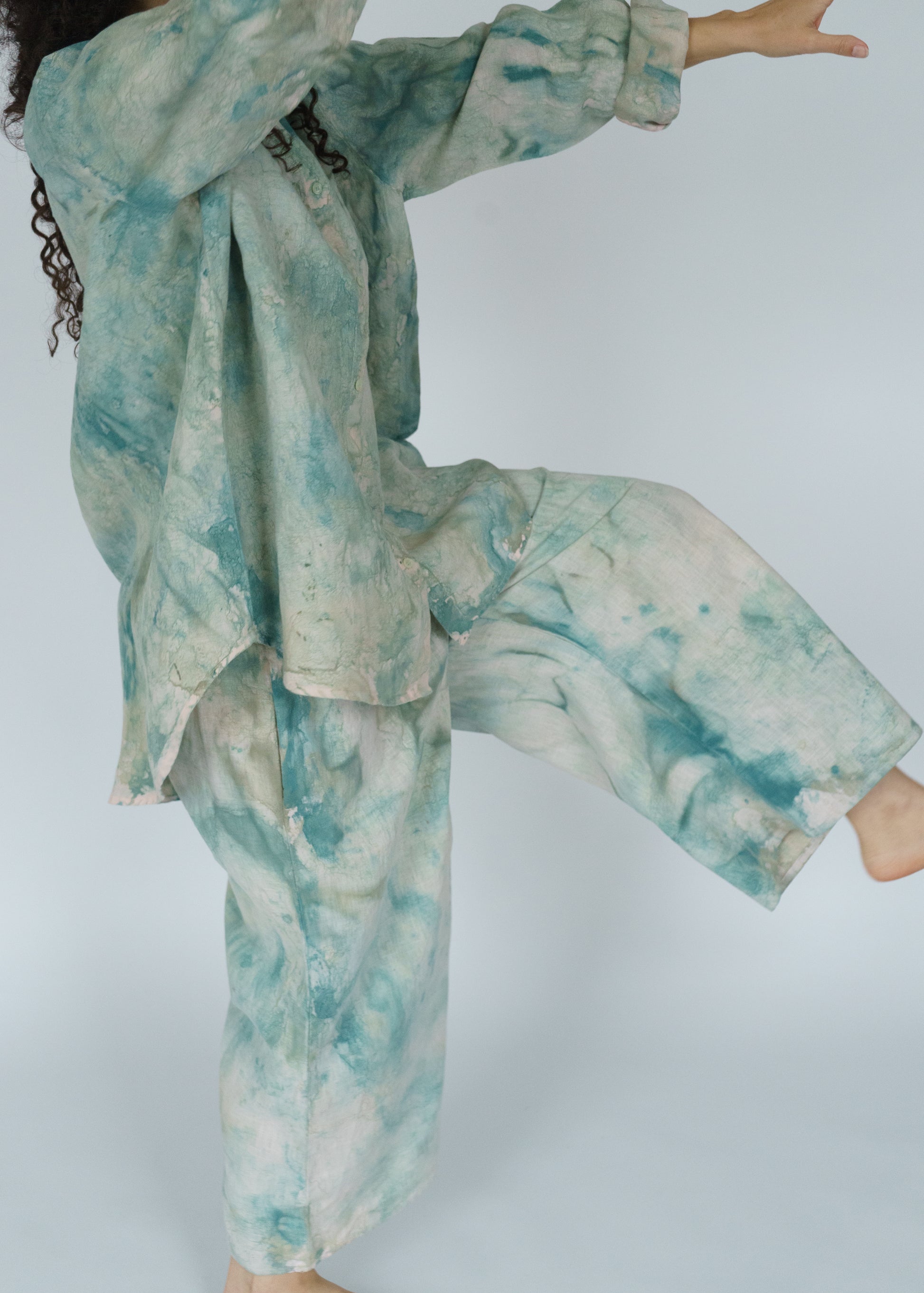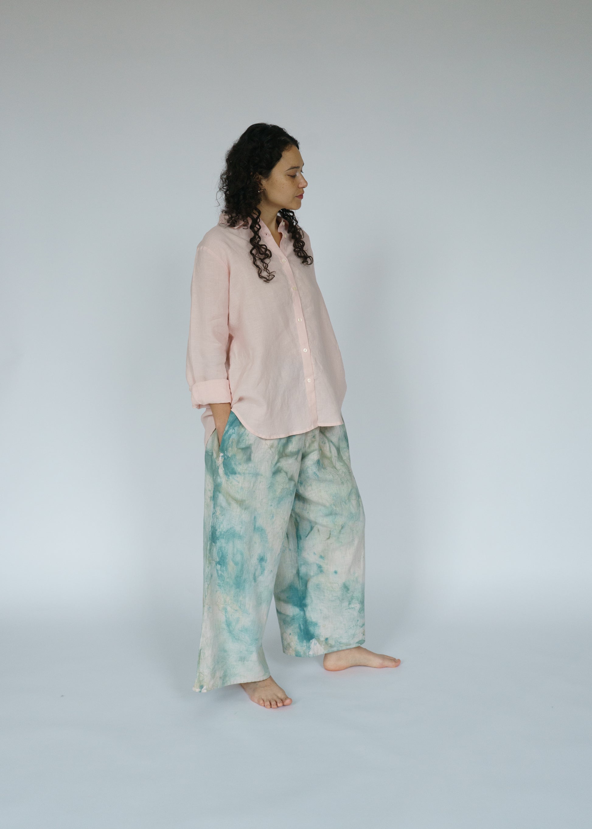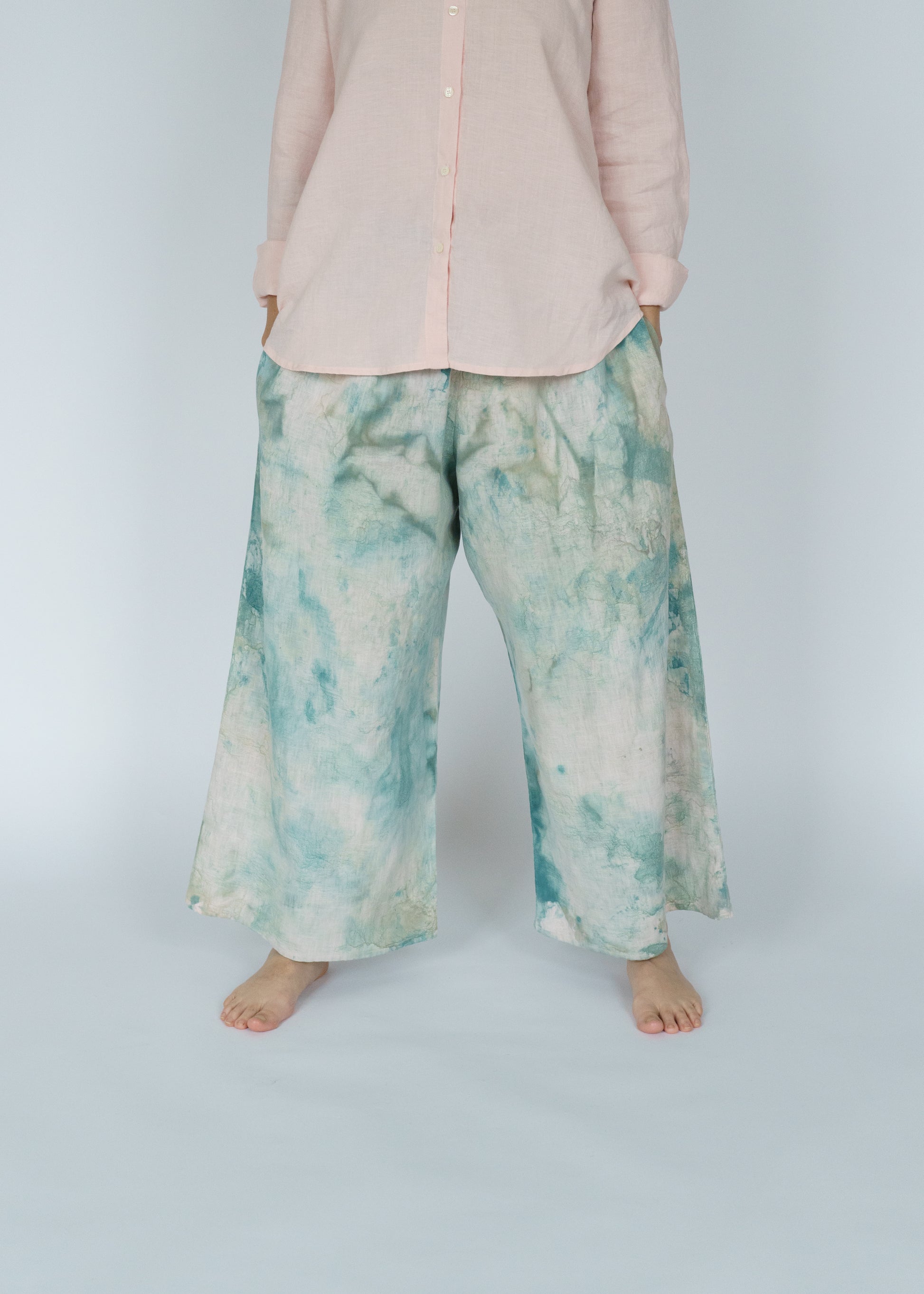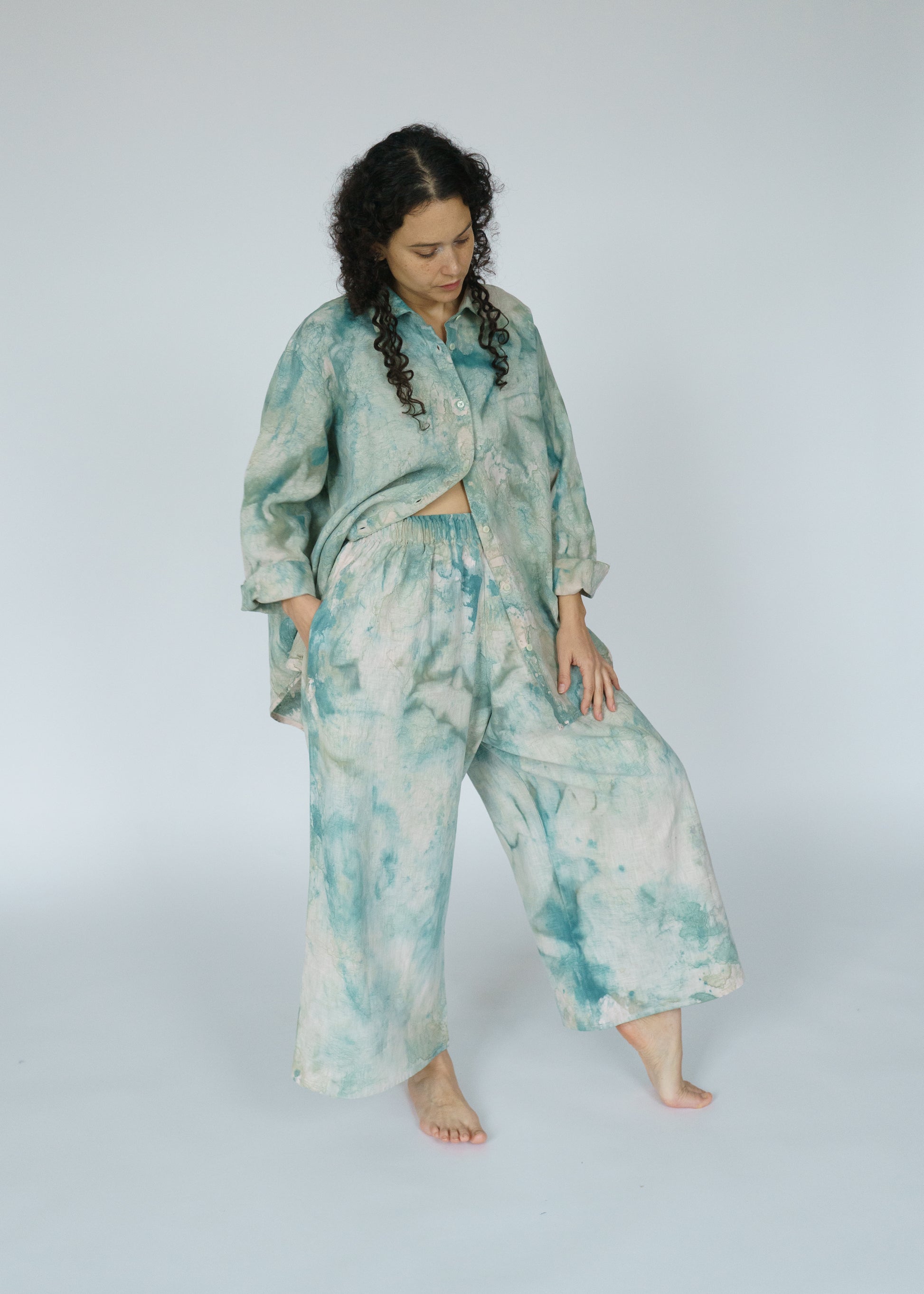 The Swayers in Thorn feel like walking through a sun-dappled forest — soft, fluid, and painted in shades of moss and magic. Each pair is hand-painted, so no two are exactly alike. You can see the brushwork, the motion, the human touch in every fold. They’re easy and elegant, roomy and real — the kind of pants that make “effortless” feel truly effortless. And paint on linen is as good as it gets. The pigment settles into the fabric more and more with each wash and wear. In a few years, these pants will be just as much as a headturner.